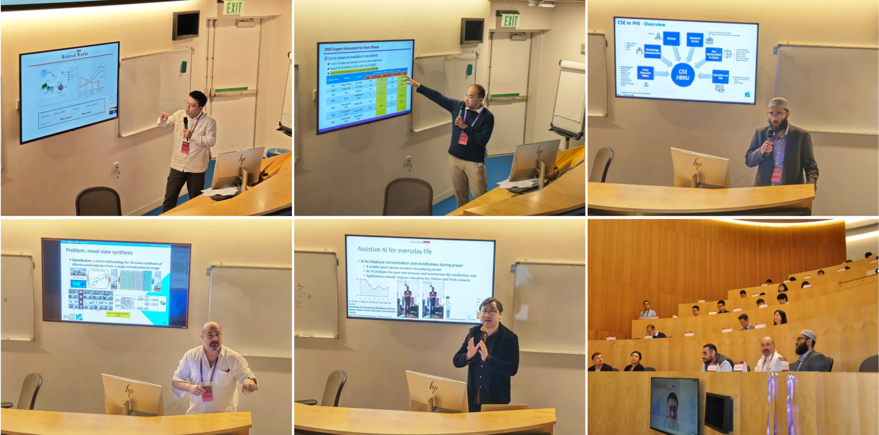 在特邀报告环节,来自清华大学电子系与哈利法大学CSE的五位老师分别从各自的研究领域出发,分享了他们在研究方向上遇到的技术难题及其创新解决方案,引领与会同学深刻认识可持续创新的迫切需求与重大意义。清华大学电子系助理教授姚权铭向与会人员介绍了知识驱动的简化学习理念,该方法从数据中挖掘核心知识,通过将复杂数据空间中的问题映射至常规知识空间,简化了模型的复杂度,为突破尺度定律对人工智能发展的制约提供了新思路。针对卫星导航系统在城市环境中定位不准确的问题,清华大学电子系助理研究员王腾飞带来了卫星系统+5G的融合定位方案。该方案利用现有的5G基础设施,有效提升了智能手机在城市复杂环境中的定位性能。哈利法大学CSE副教授Tanvir Alam分享了其团队如何利用AI技术,在癌症治疗、药物研发、抗菌肽设计及其活性预测等医药生物领域取得的丰硕成果与宝贵经验。哈利法大学CSE副教授Marco Agus介绍了其团队通过视觉计算技术,解决医学影像强化以及影像分析,室内数字孪生构建,文化遗产可视化等问题的过程,展现了视觉计算技术的强大潜力。哈利法大学CSE教授Yin Yang介绍了CSE在AI领域的诸多创新成果与突破,比如人群行为分析,交通事件预测技术对提高卡塔尔社会治理效率、增强公共安全等方面发挥的重要作用,智慧医疗对医疗诊断的助力等。嘉宾们的深入浅出的讲解,让与会者深刻地认识到信息技术正如何推动世界变革,而且使同学们得以学习不同领域的丰富知识与创新思维方式,极大地拓宽了他们的学术视野。