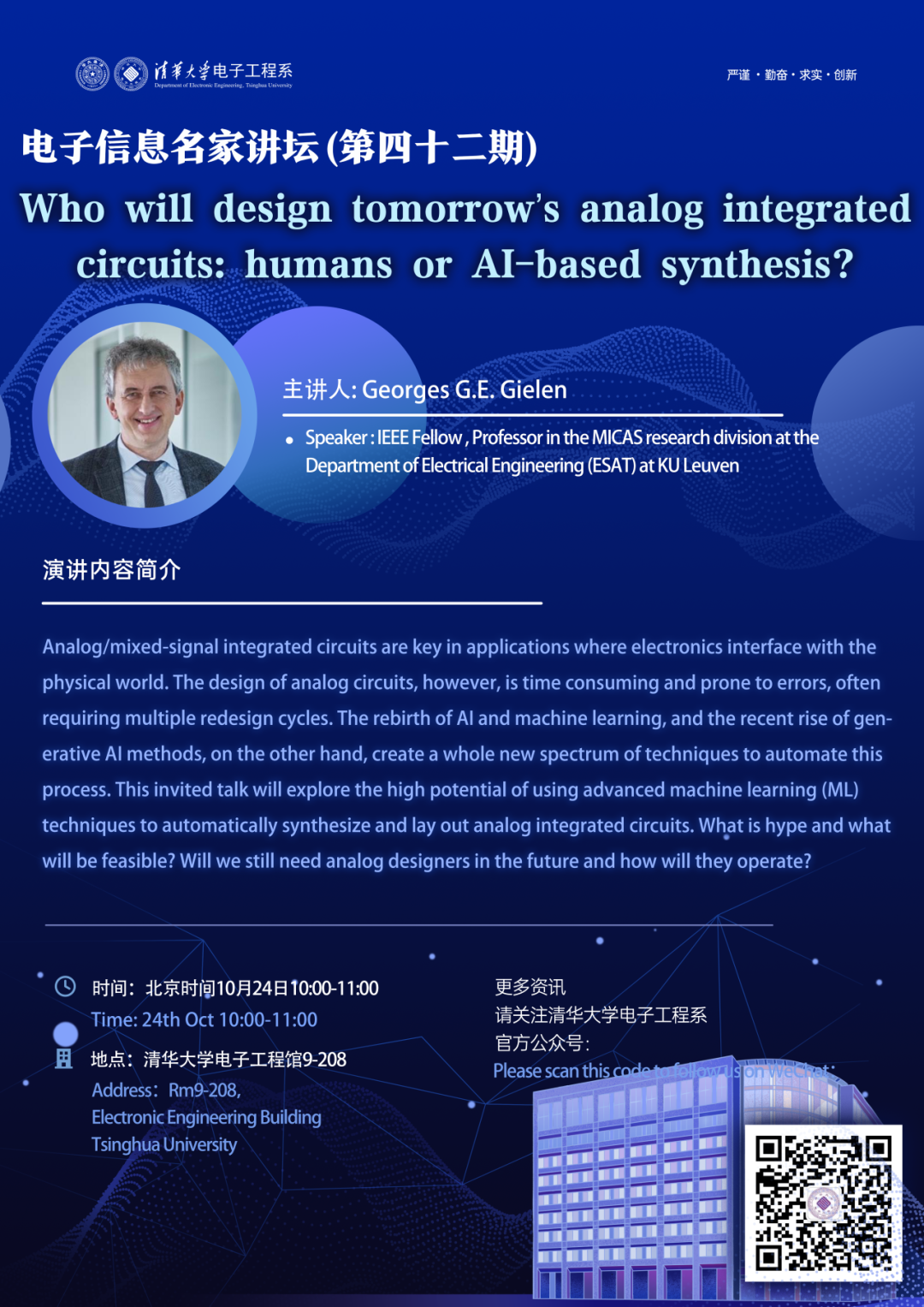 本期讲坛有幸邀请Georges G.E. Gielen作题为Who will design tomorrow’s analog integrated circuits: humans or AI-based synthesis? 的报告。