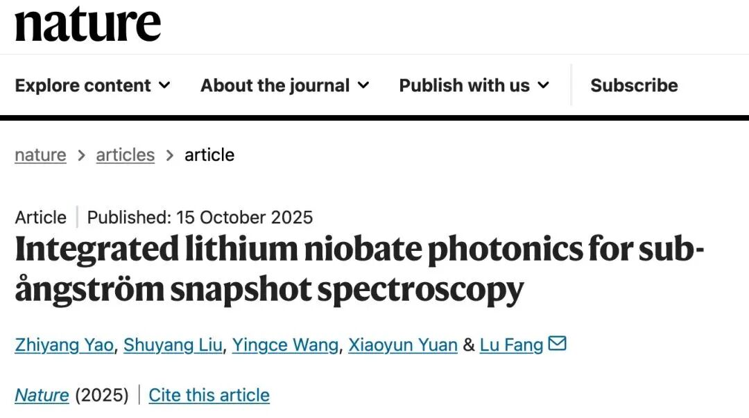 以《集成铌酸锂光子学亚埃米级快照光谱成像》(“Integrated lithium niobate photonics for sub-angstrom snapshot spectroscopy”)为题