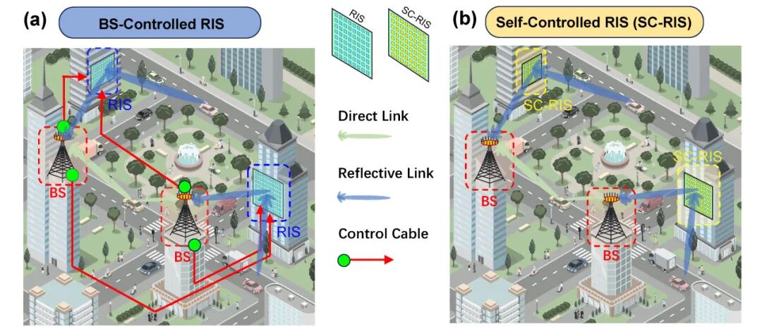 图1. (a) 现有的基站控制RIS; (b)提出的自控制RIS(SC-RIS)