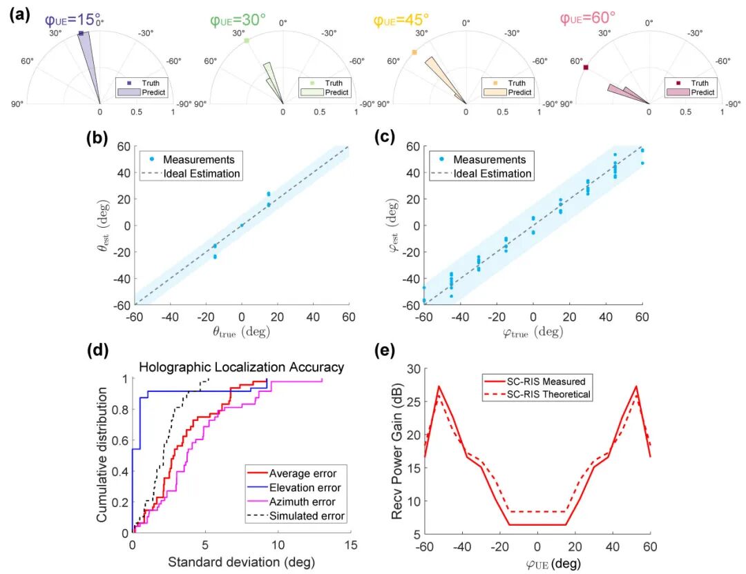 针对所提的SC-RIS硬件架构和算法,研究团队研制了一块32×32单元的SC-RIS硬件,并基于Xilinx FPGA+AD9361构成软件定义无线电平台实现了完整的正交频分复用(OFDM)通信系统,进行了RIS辅助的OFDM通信系统实测。图5中的实测结果表明:在不同的基站-用户角度配置下,所提全息定位算法能将俯仰角和方位角的定位误差分别降低到2.61°与5.24°。受益于最大似然超分辨率算法的应用,全息定位算法的误差可以低于相应阵列分辨率极限(6.62°)。在完成对用户的全息定位之后,就可以根据用户相对于RIS的几何关系来计算RIS赋相矩阵,从而完成RIS波束赋形。实测结果表明:对未调制信息的单音信号,所提RIS闭环控制方案能在RIS不受基站控制的前提下,相比随机RIS赋相获得16.4 dB的用户接收信号功率增益。