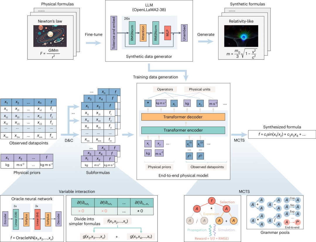 在这一框架中,数学分析起到了核心支撑作用。研究团队提出的“公式分解模块”利用神经网络的二阶导数矩阵(Hessian矩阵)分析变量间的非线性耦合关系。当模型检测到某些变量之间的二阶偏导接近于零时,便可判断它们在物理规律中相互独立,从而将复杂方程分解为若干可独立求解的子式。通过这一数学机制,模型能够在不依赖具体公式结构的情况下,自动识别物理变量之间的结构化关系,显著降低搜索复杂度,使生成的结果更加简洁且符合物理意义。