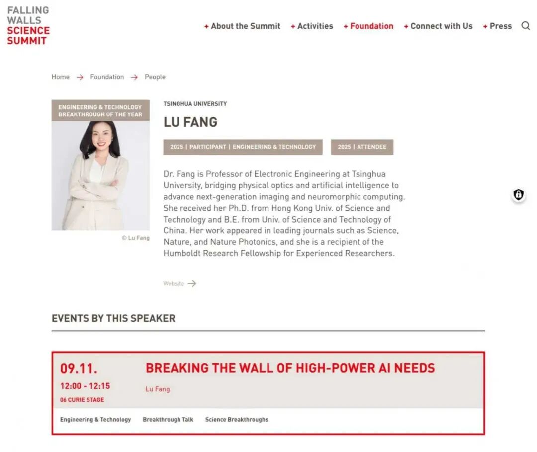 近日,清华大学电子工程系方璐教授凭借其在「Breaking the Wall of High-Power AI Needs」的原创研究,获Falling Walls 2025年度科学突破奖(SCIENCE BREAKTHROUGHS OF THE YEAR 2025),并受邀赴德国柏林出席Falling Walls 科学峰会,进行主旨演讲。