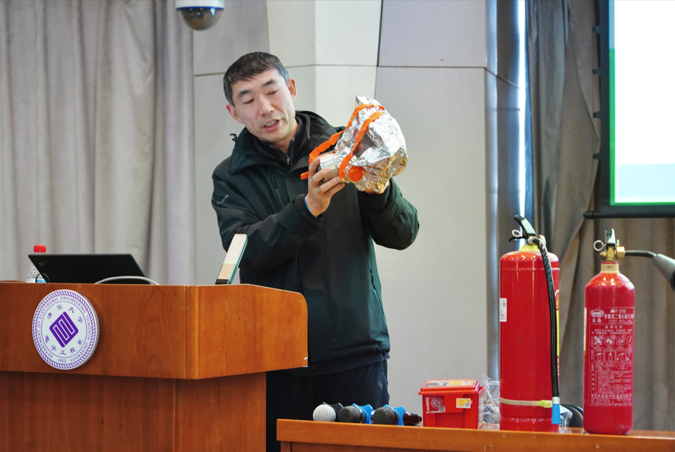 保卫处防火科李源进行消防安全知识培训讲座。他详细介绍了防火须知、火灾案例、消防基础、隐患排查等知识,介绍了常见消防器材设施分类,灭火器类型及使用方法以及正确高效的火警报警流程,并从专业角度讲解了火场逃生应急事项。