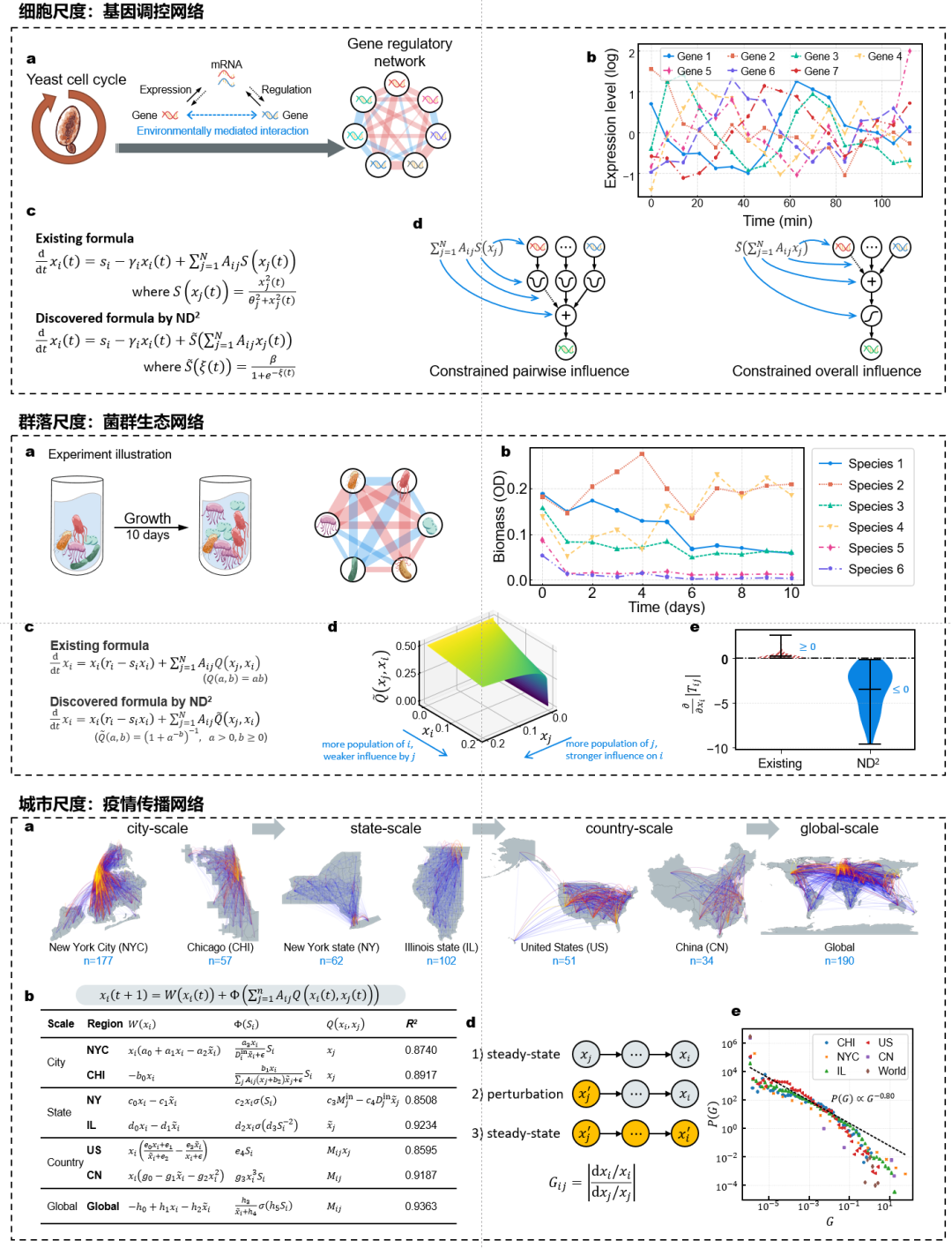 在上述 反绎 式AI 框架中,揭示复杂系统宏观行为背后的微观机制,关键在于从数据中提炼能够解释系统演化规律的数学表达式。为此,研究团队提出了面向网络动力学的神经符号回归方法(ND2)(图2);并进一步,将其应用于从细胞尺度到城市尺度,跨越基因、生态和社会网络,发现了不同复杂系统背后的微观动力学规律(图3), 以题为《Discovering network dynamics with neural symbolic regression》(基于神经符号回归的网络动力学发现)发表于国际顶级期刊《Nature Computational Science》[2]。该研究表明在反绎式AI框架下神经符号回归对于 揭示复杂系统动力学规律、发现新科学知识方面 的具体潜力,为基础科学研究和科学发现提供了全新的方法。