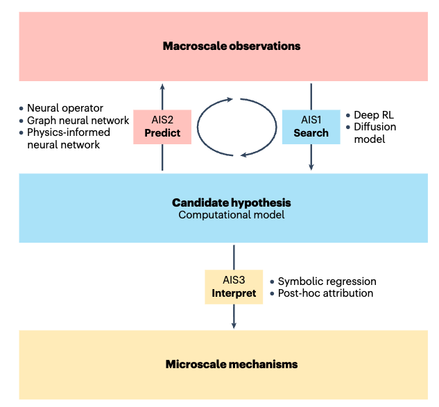 :通过深度强化学习(Deep RL)与扩散模型(Diffusion Model)等先进人工智能方法,在庞大的假设空间中生成潜在的微观机制模型;