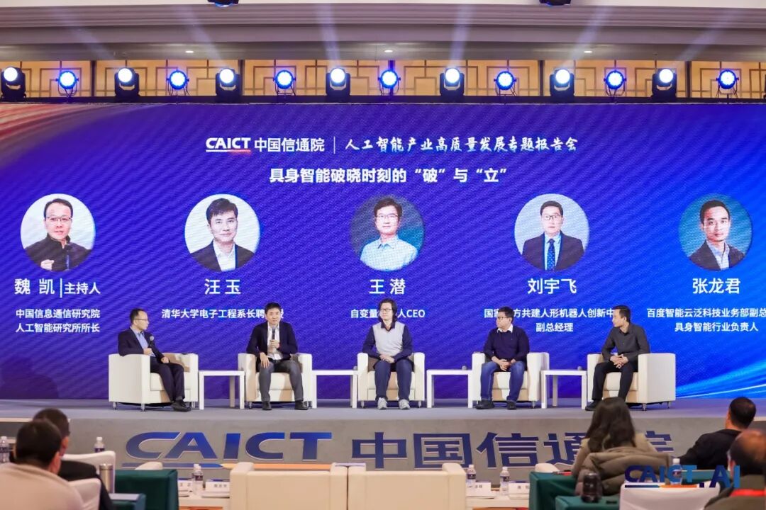 主旨演讲结束后,“具身智能破晓时刻的‘破’与‘立’” 圆桌论坛如期举行,由中国信通院人工智能研究所所长魏凯主持,汪玉与自变量机器人CEO王潜、国家地方共建人形机器人创新中心副总经理刘宇飞、百度智能云副总经理张龙君同台对话。汪玉指出,具身智能发展需整合所有能力的大模型,2025年机器人运动控制显著提升,真机强化学习将迎阶段性成果,行业仍处初级阶段,核心短板为数据与模型能力,未来1-3年半封闭场景可人类接管的具身智能将批量落地, 呼吁央企国企加强和高校合作,加大校企合作的投入。嘉宾们多维度探讨,为具身智能从 “技术热” 走向 “产业热” 提供宝贵洞见。