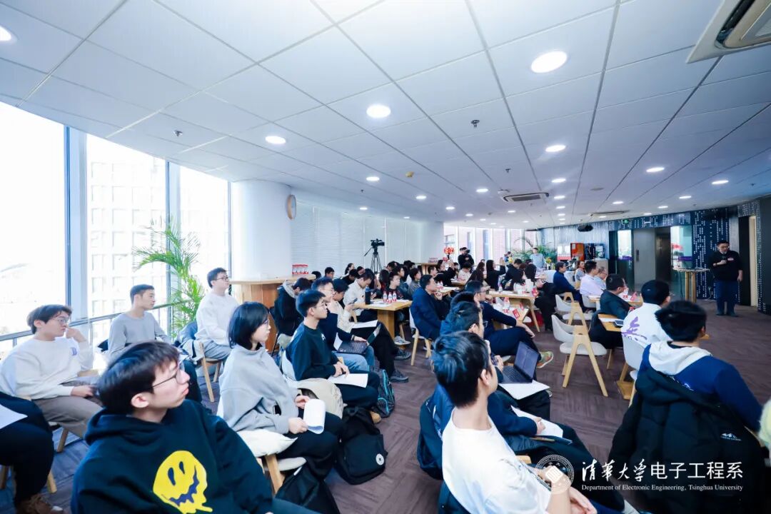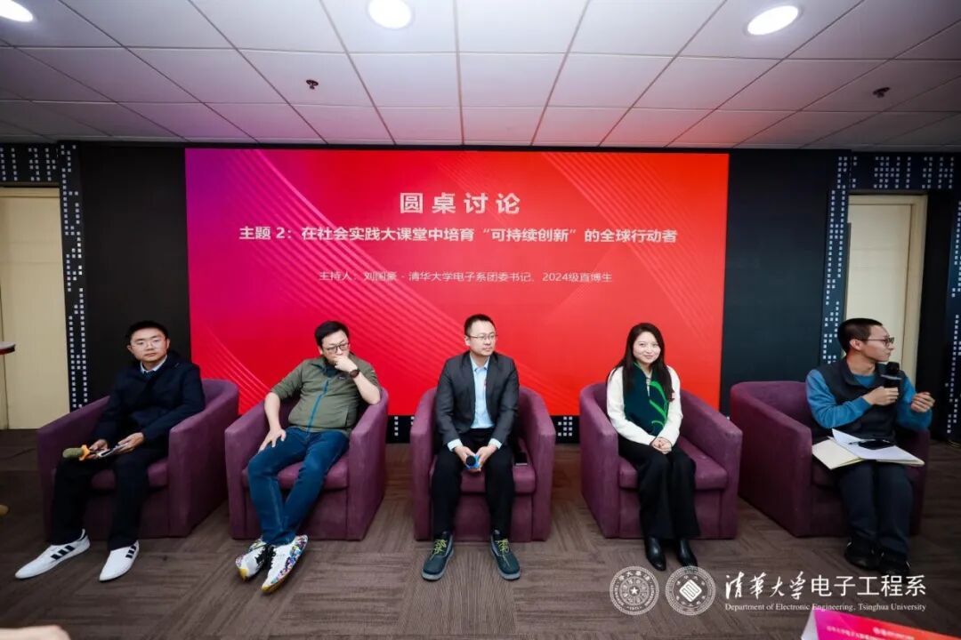 随后进行了圆桌讨论,两场专题讨论分别聚焦不同主题:第一场是由“因材施教”AI+系统方向2021级学员、电子系2025级直博生李欣恬主持,围绕“AI时代电子信息专业人才培养的新模式、新挑战”展开探讨。对话嘉宾是兆讯恒达科技股份有限公司董事长李立、北京易智时代数字科技有限公司常务副总、产业技术研究院院长王红梅、中国电信人工智能研究院(TeleAI)科研管理总监闫亚琼、浦江实验室张新茹。第二场由刘国豪主持,以“在社会实践大课堂中培育可持续创新的全球行动者”为主题进行交流。真格基金管理合伙人戴雨森、北京鉴智科技有限公司合伙人刘竞秀、深圳市亿道集团人工智能研究院院长伍俊龙、思特威(上海)电子科技股份有限公司副总经理赵颂恩受邀参与讨论。嘉宾们从产业与学术视角分享了个人见解,与参会师生围绕议题展开了深入讨论。随着嘉宾们的精彩解答,现场掌声雷动,活动现场气氛热烈。