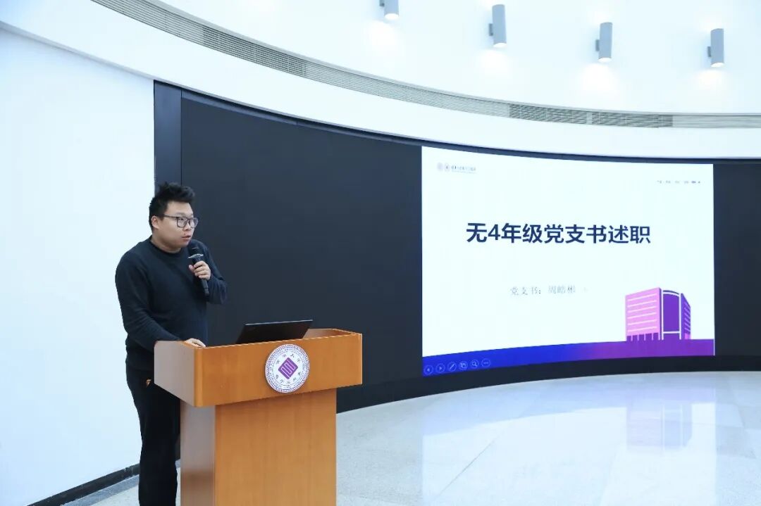 无4党支部书记周皓彬重点介绍了思想政治教育、党团班共建以及理论与实践结合三大支部核心工作。支部成员依托系TMS分会资源广泛开展政治经济学讲座以及支书讲党课等活动,积极探索新型党团班共建机制,以理论学习及寒暑期实践为抓手,鼓励非党课小组同学参与到党课小组活动中。